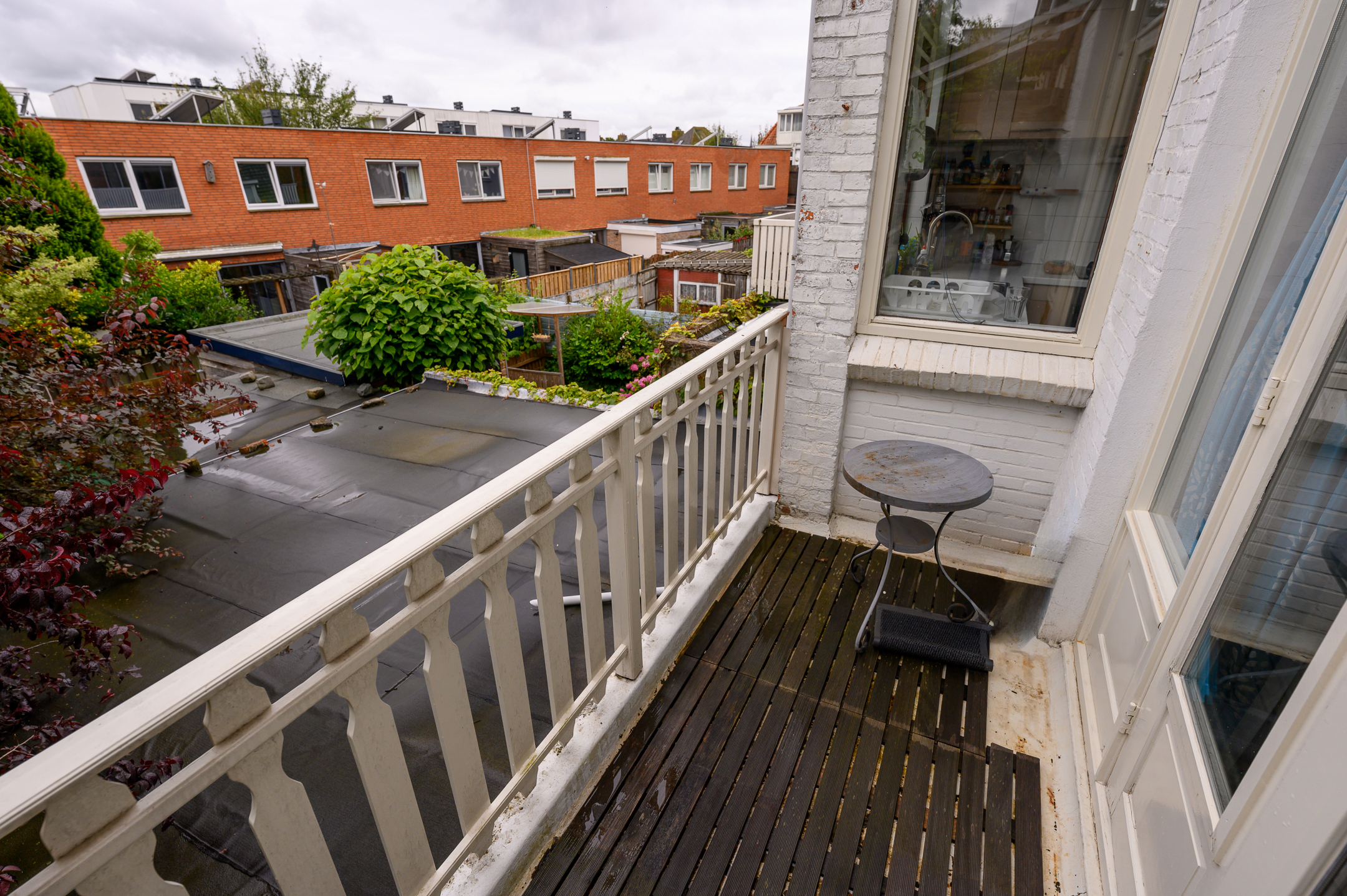 Eerste Verdieping: overloop, apart toilet, woonkamer thans gesplitst in 2 kamers waarvan de achtergelegen (woon)kamer met aangrenzend moderne ruime keuken met diverse inbouwapparatuur waaronder gaskookplaat, afzuigkap, combi oven/magnetron, vaatwasser en koel- vriescombinatie en toegang tot zonnig balkon, voorkamer en voor zijkamer;