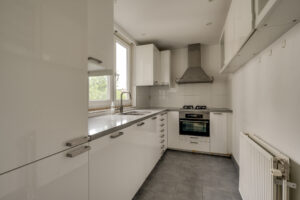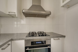 Eerste Verdieping: overloop, apart toilet, garderobe- provisiekast, voorkamer thans gesplitst in 2 kamers, achtergelegen (woon)kamer met aangrenzend moderne ruime keuken met diverse inbouwapparatuur waaronder gaskookplaat, afzuigkap, combi oven/magnetron, vaatwasser en koel- vriescombinatie en draai-kiepraam in kunststof kozijn met dubbele beglazing;