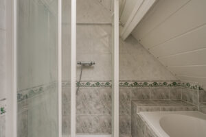 Tweede verdieping: Overloop met wasmachineruimte, ruime voorslaapkamer met vaste schuifwandkast, geheel betegelde badkamer voorzien van ligbad, douchecabine, hangend toilet, wastafel en groot dakvenster, ruime slaapkamer aan de achterzijde met deur naar zonnig balkon op het zuiden.